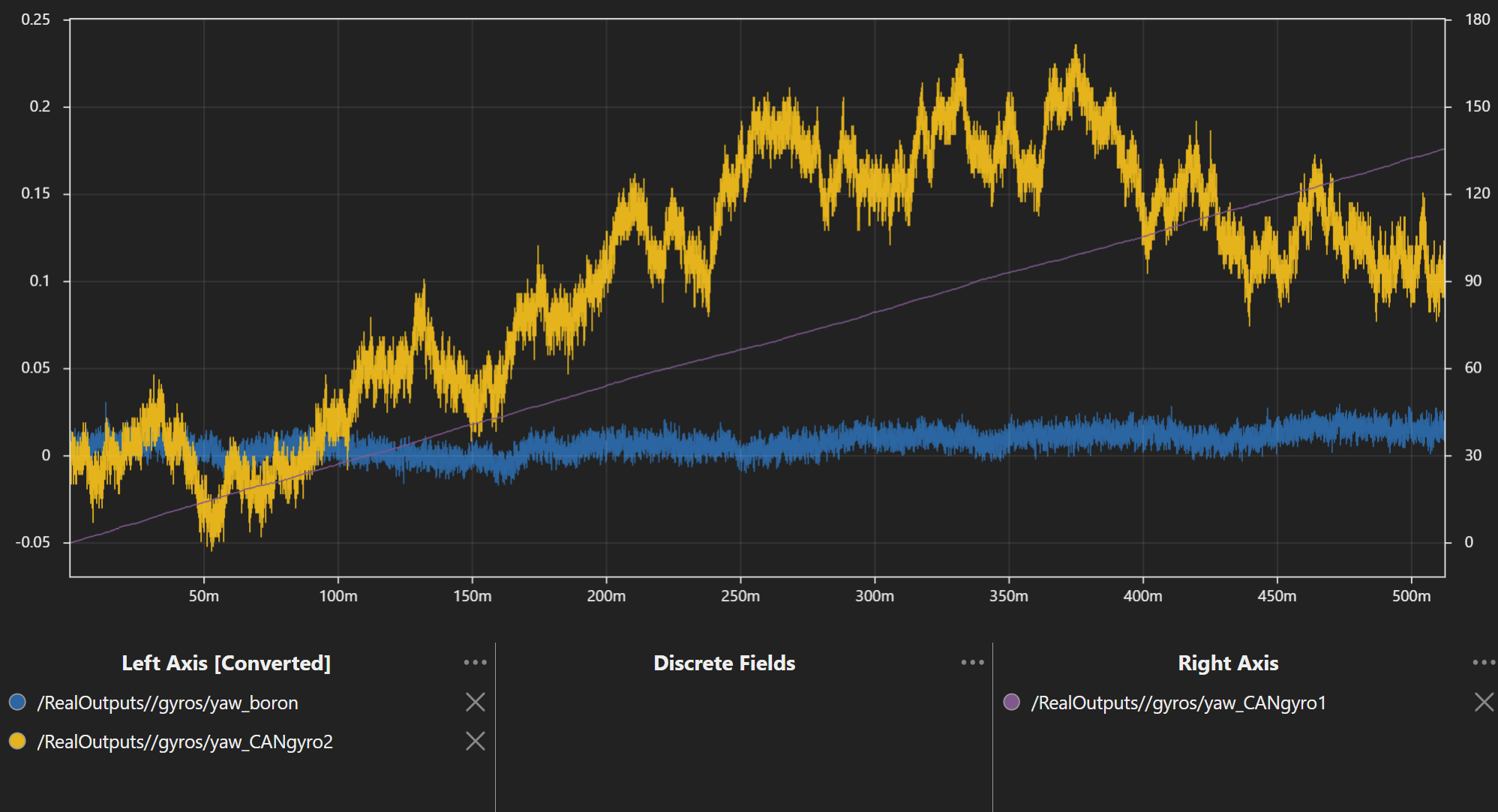 The Boron Canandgyro is rated for some level of in-motion and and no-motion drift. But how does it stack up to the competition? Below, we have performed some performance comparisons between the Boron and a couple other gyros common in FRC.