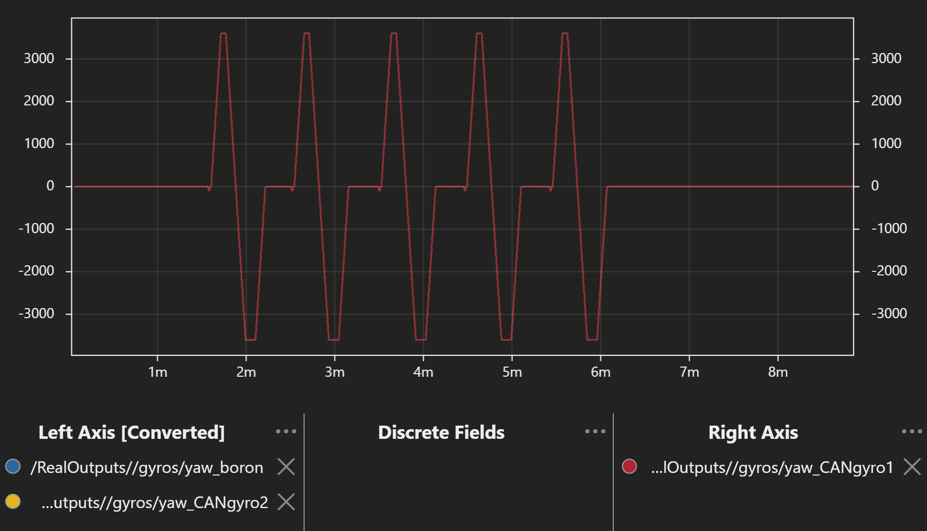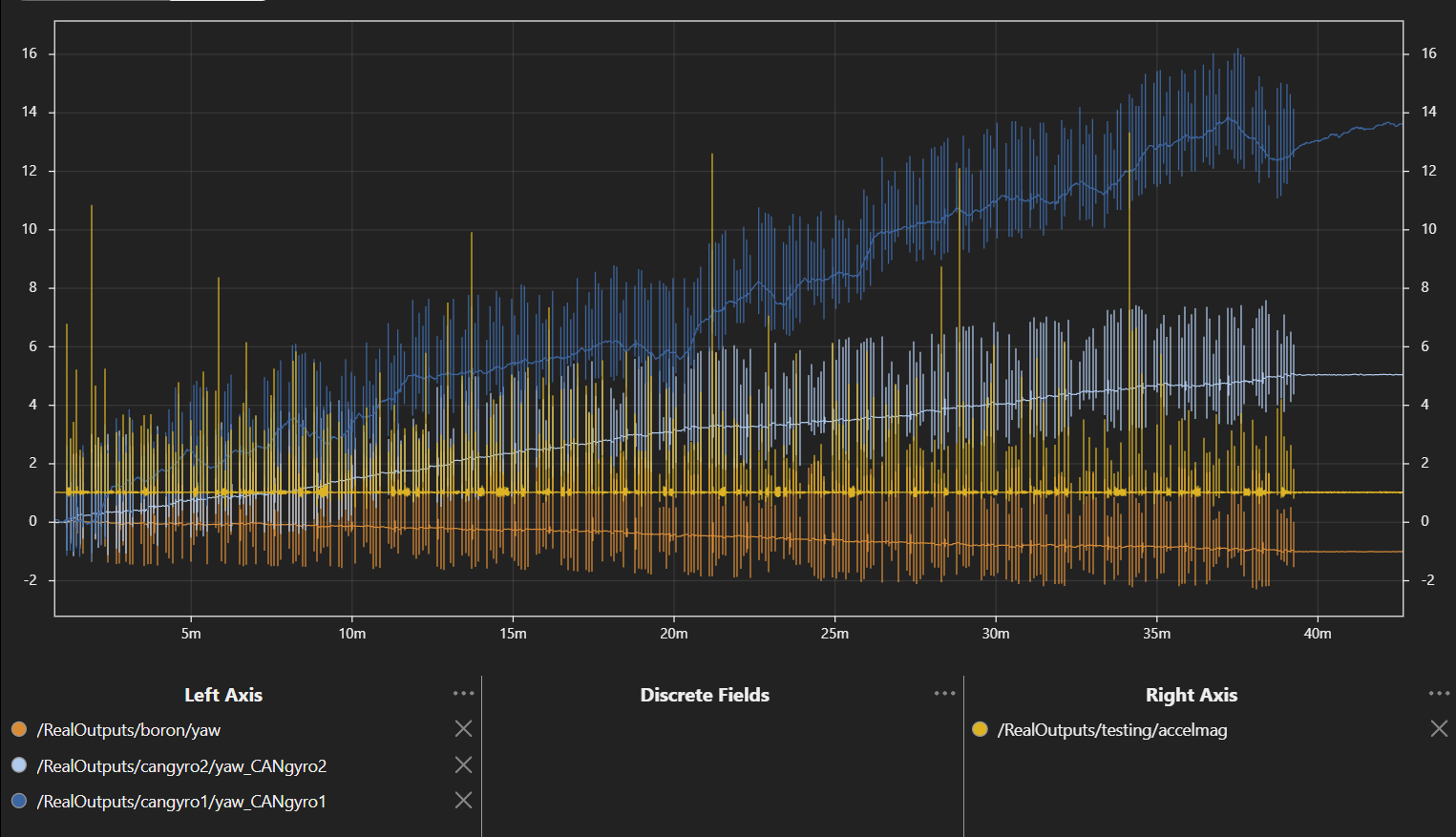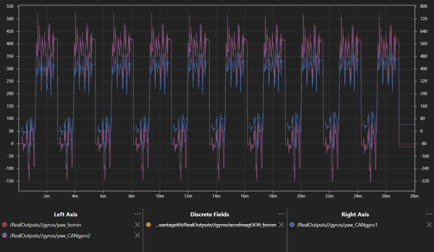 The fixture has more random vibration than a typical FRC robot would have. This increases the drift to closer to what would be seen in an FRC match. Non-FRC applications may see varying vibration as well, such as engine vibration in cars. If your application has heavy vibration or very frequent collisions, you may experience more in-motion yaw drift. Many factors go into a good in-motion drift test, and it’s impossible to capture all of those in a single test. In repeated runs of this test, the Boron averaged anywhere from 0.11 to 0.40 deg/min of drift, and CAN Gyro 2 averaged 0.30 to 0.97 deg/min of drift. Running different match profiles also affected the drift. This test should be viewed as a point of comparison between products, and not necessarily an example of the exact performance you will get with a Boron.